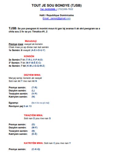 La mission de Tout Je Sou Bondye (TJSB) est de s'engager dans la lutte contre l'analphabétisme à travers le monde, en se concentrant principalement sur les régions les plus proches d'Haïti, qui est d'ailleurs originaire des membres fondateurs de l'organisation. TJSB vise à utiliser les ressources à sa disposition pour mettre en place des camps d'apprentissage et des projets partout où le besoin d'éducation de base devrait se manifester comme étant un obstacle majeur au développement - qu'il soit économique, social, politique ou académique - de la communauté